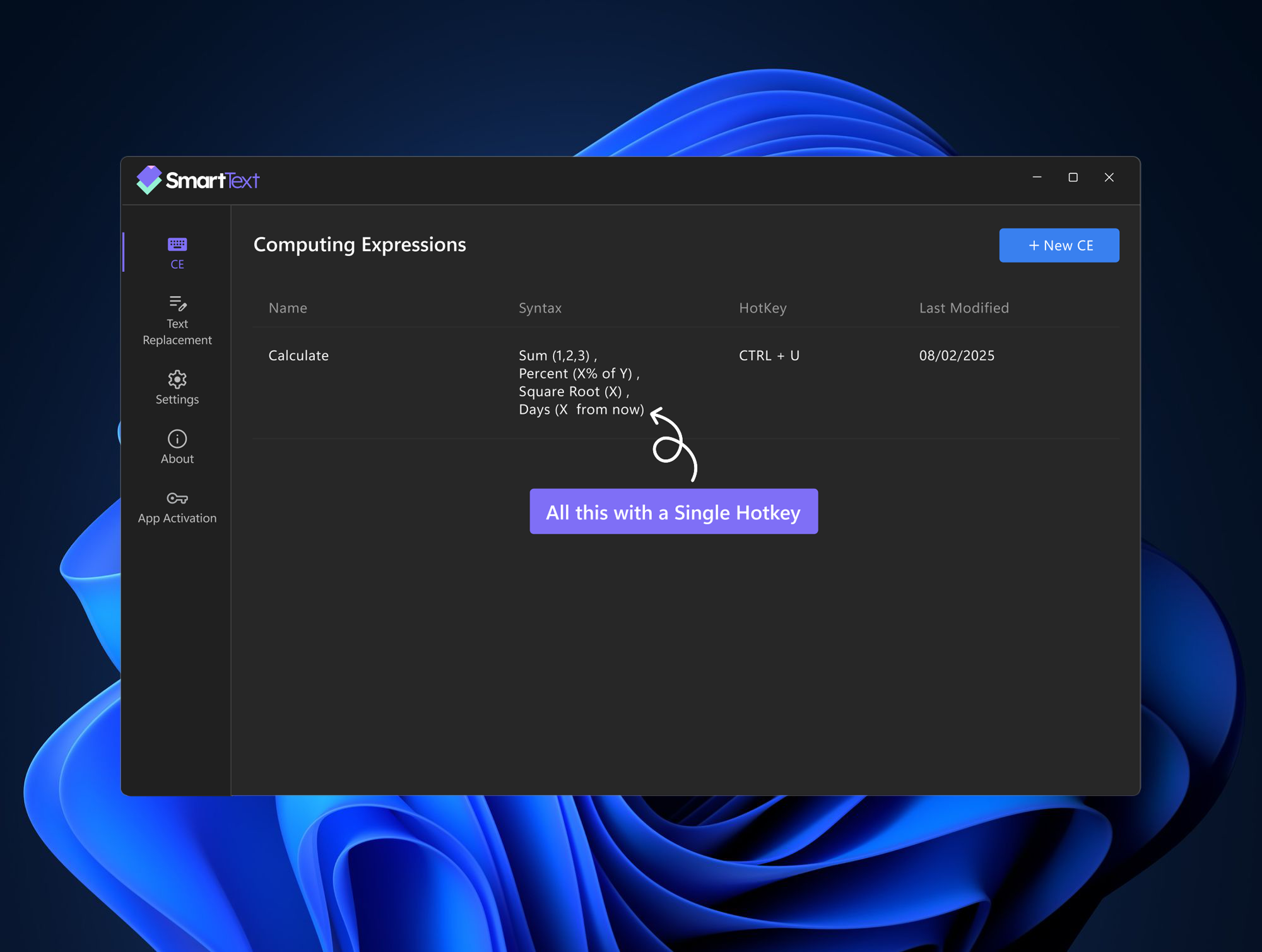 Supercharge your efficiency with SmartText’s computational capabilities.Execute complex calculations or instantly replace predefined text with just a keystroke. For instance, bind functions like {Sum(10,20)} to a hotkey, and SmartText will automatically compute the result. Similarly, bind text such as ({name}), and with a single keypress, it will be replaced with the designated value, like John.